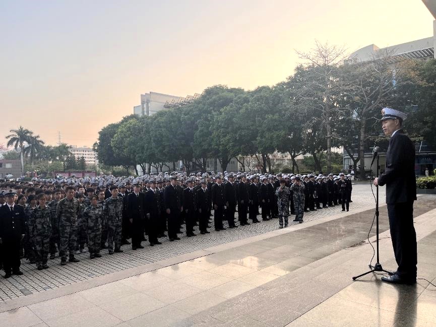 随后,在开展主题教育活动中,林少栋老师首先对同学们良好的精神风貌表示肯定。林老师指出,2022年海运学子表现良好,严格遵守各项规章制度,自觉做好疫情防控“第一责任人”,大证统考及法考保持较高的通过率。林老师强调,作为学校半军事管理的重要组成部分,每周一的升旗仪式是同学们爱国情、强国志、报国行的精神凝聚与情感寄托。希望同学们在接下来的学习生活中,以半军管培养出来的坚毅和担当,展现海运学子砥砺向上的精神力量。希望同学们一是要胸怀祖国,让爱国主义精神在心中牢牢扎根;二要不断深化半军事管理内涵,提高体育锻炼意识和自主学习意识,在自主学习中实现学有所思、学有所获和学有所成,做到“天天有进步,周周有收获”;三要肩负历史使命,坚定前进信心,立大志、明大德、成大才、担大任,在激扬青春、开拓人生、奉献社会的进程中展现青春风采。